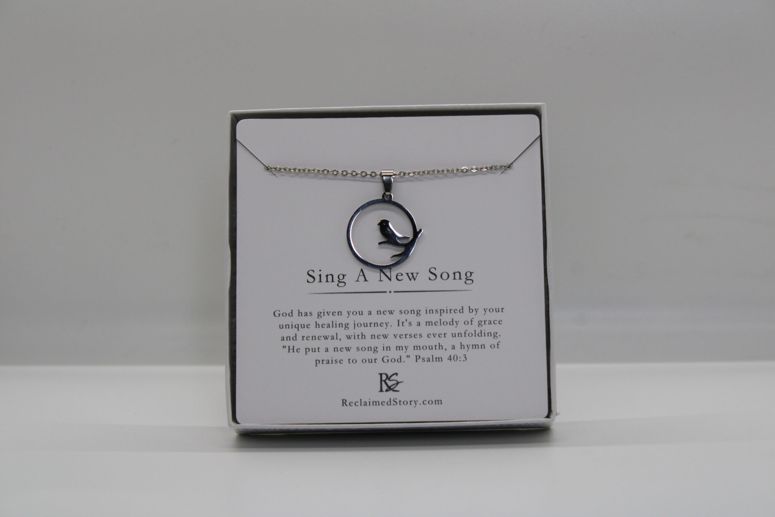 Silver-toned circular pendant with a branch and a bird in the center. On a 17″ cable chain, you can wear it often; it is stainless steel, tarnish-free, lead-free, and nickel-free.