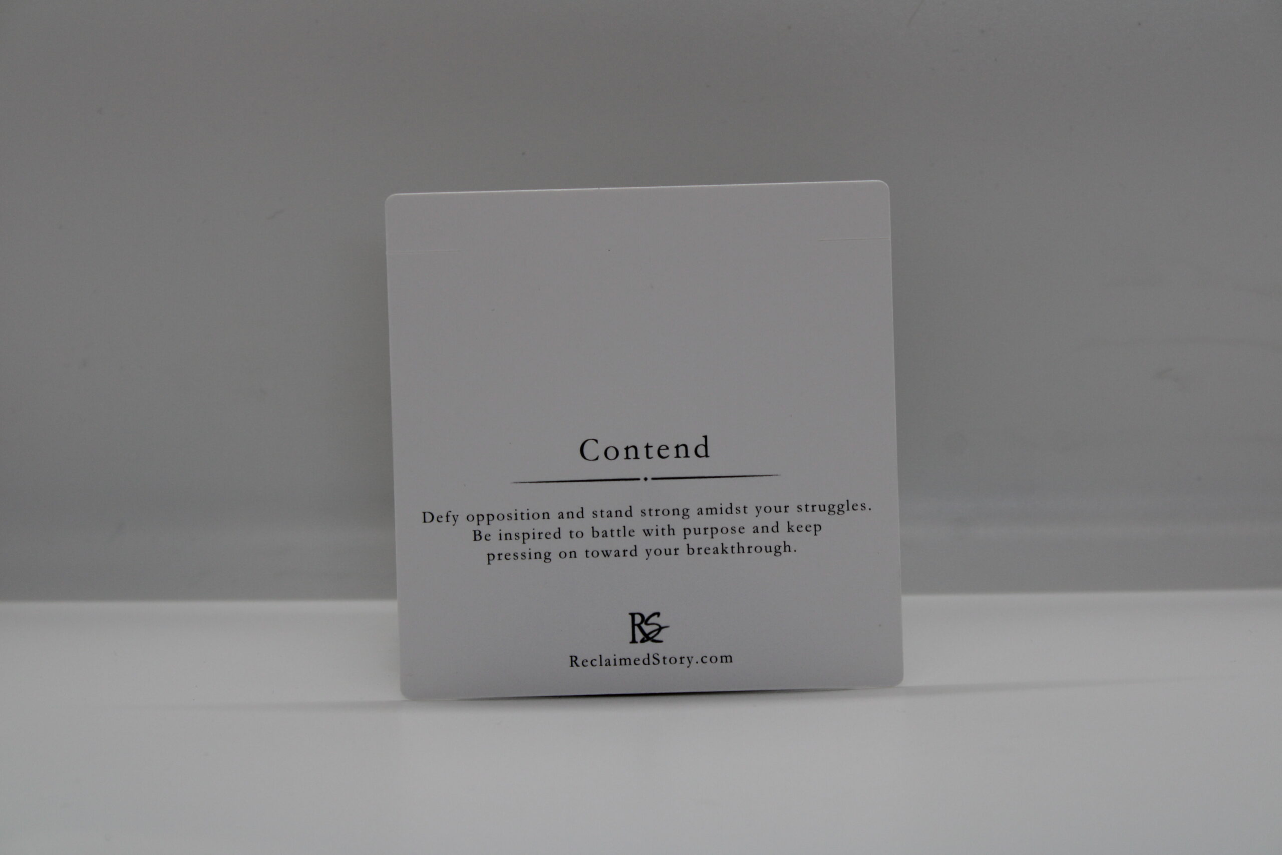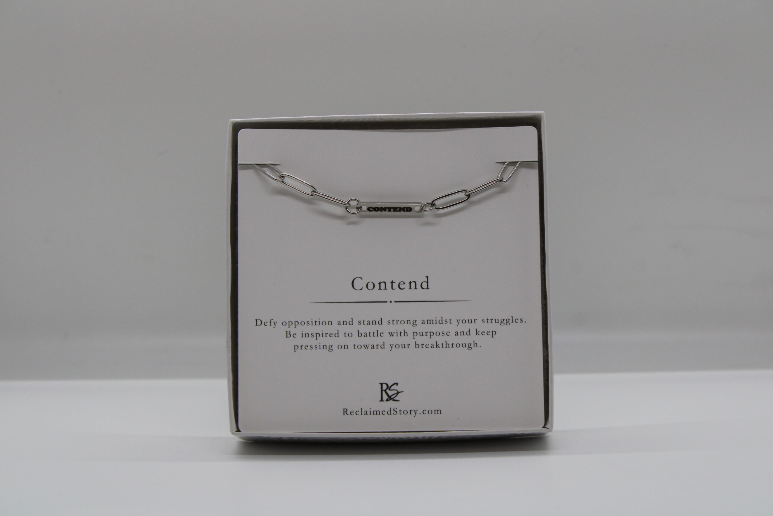 word “Contend” in black. It is just over 7” in length. Made of surgical stainless steel, it is hypoallergenic,
