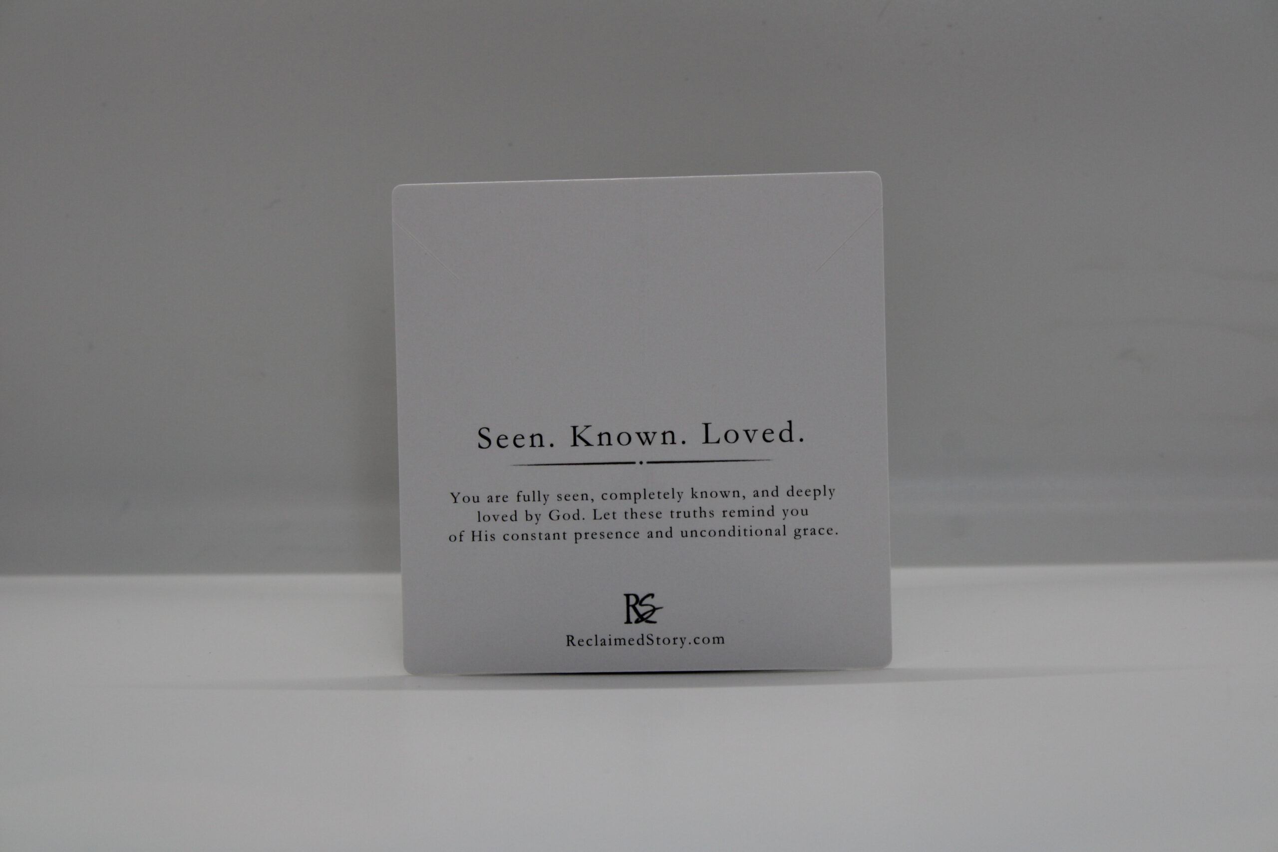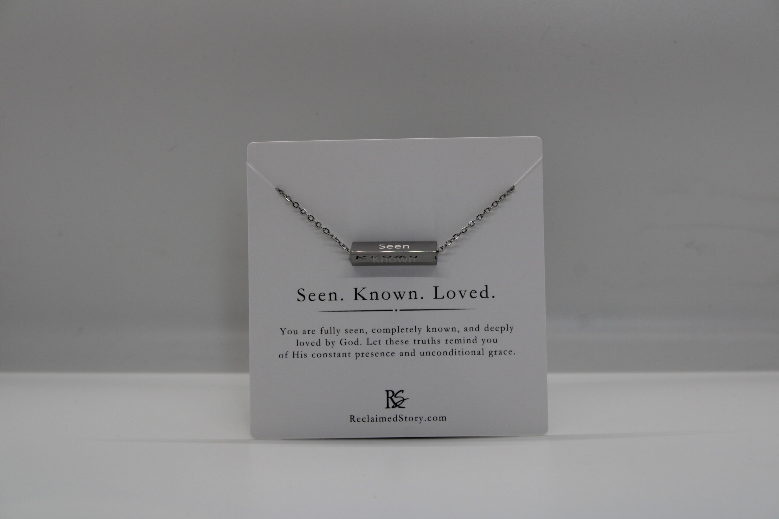 It is elegantly adorned with a solid, polished three-sided triangular bar engraved on each side with the words Seen -Known – Loved, measuring 1” wide and .25” high. The chain adjusts between 18” and 20” with a lobster claw clasp—stainless steel, tarnish free, lead and nickel free.
